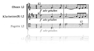 簡単に説明しよう。ハ長調はC(ド)の音を主音とする調性で、基本となる和音はC(ド)・E(ミ)・G(ソ)である。前奏曲が始まって2小節目の4拍目、ヴィオラとトロンボーンの2番に与えられた音はCis(ド♯)(譜例②)。ハ長調の響きの中にコッソリと仕込まれた"異物"のごときCisがハーモニーの全体像にコントラストをもたらす効果を生みだし、汁粉に入れる塩と同じようにハ長調の響きが一層強調されるのである。同時にこの"異物"はハーモニーに重層的な複雑さをもたらし、ノー天気な明るさとは一線を画す響きの世界の構築を可能としているのである。《トリスタン》の半音階進行で調性の壁を崩壊させる寸前まで進んだこの時期のワーグナーならではの高等テクニックということができる。こうした仕掛けはこの本作の随所に散りばめられているのである。