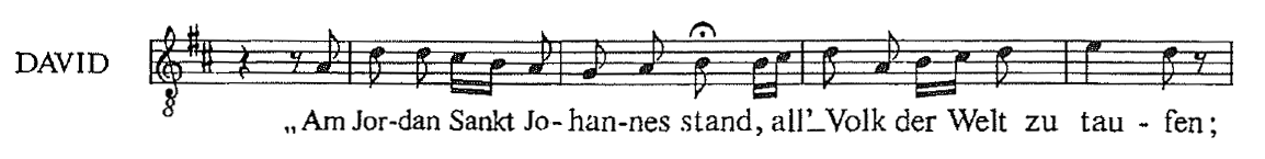 聖ヨハネ祭の朝ということでザックスはかねて練習していた祝詞を歌うよう指示する。前夜の騒ぎが脳裏に焼き付いているダフィトは、思わずベックメッサーの歌ったセレナードの旋律(譜例37)で歌ってしまう。すかさず木管楽器が「殴り合いの動機」(譜例38)を回想する。「何だ!」とザックスに一喝されたダフィトは、ようやく落ち着きを取り戻し「ヨルダン川のほとりに聖ヨハネが立ちて...」と正しく歌った(譜例41)ところで、ハンスという名前はヨハネ(ヨハネス)に由来するもので、この日が師匠の命名日であることに気付く。