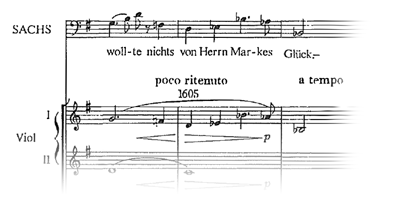 誰もいなくなったザックスの仕事部屋。机の上には先ほどザックスがヴァルターの歌った詩を書きとめた紙が残されている。オーケストラからは「ベックメッサーのセレナード」「殴り合いの動機」「諦念の動機」などが次々と現われ、「ベックメッサーの動機」(譜例26)とともに、ベックメッサーが挙動不審の様子でコッソリ忍び込んでくる。前夜の乱闘騒ぎでダフィトに散々な目に遭わされたため足を引きずり、痛々しい姿である。彼の脳裏には昨晩の悪夢が蘇ってくるのか、走馬灯を見るかのように「殴り合いの動機」をはじめ、前夜の出来事を回想するライトモティーフが次々と現われる。キョロキョロするうちにベックメッサーは机上の紙に視線を止める。その先にあるのが何であるかは、オーケストラが「朝の夢の歌」の旋律を演奏することで明らかだ。この場面、ライトモティーフの効用が分かりやすい形でフル活用されている。
