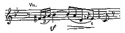 「これは欺瞞だ!」と激しく詰め寄るブリュンヒルデ。彼女とジークフリートの言い合いに割って入り、火に油を注ぐように仕向けるハーゲン。ここでもブリュンヒルデと群集の動揺を表わすかのようにシンコペーション(譜例㊳)のリズムが使われる。それに乗じてハーゲンは「いいか、この女の言い分をよく聞くのだ!」と巧みに群集を煽っていく。家臣たちの前で面目を失うグンター。いきなりの異様な事態に驚く家臣たちも絡んで、劇的緊張が高まっていく。