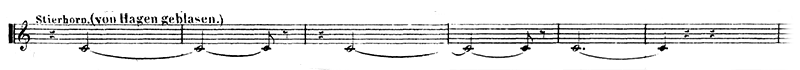 バス・クラリネットの導入にホルンが1本ずつ加わっていき、全8本になるまで和音(譜例㉚)を膨らませていくことで、夜が次第に明けていく様子を巧みに描いた間奏。夜明けとともにジークフリートが「ジークフリート角笛の動機」(譜例⑮)とともに帰還。ブリュンヒルデの拉致がうまくいったことを誇らしげにハーゲンに話す。一方、ブリュンヒルデと一夜を共にしたのではないかと早くも嫉妬心を燃やすグートルーネ。ジークフリートは「東と西の間には北があるように...」などとおかしな言い訳をして言いくるめてしまう。
