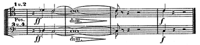 ハーゲンはなおもジークフリートの持つ指環を手に入れれば、世界を支配できるとそそのかす。ついにグンターもジークフリート殺害に同意してしまう。2人はジークフリートを狩りに呼び出して、背中を槍で突くことにする。復讐を誓うブリュンヒルデとグンター、2人を利用して指環を奪おうとするハーゲンによる三重唱。音楽は「贖罪の動機」「苦痛の動機」(譜例㊵)などを繰り返す。そこに「ギービヒの角笛の動機」とともに館からジークフリートとグートルーネの婚礼の行列が繰り出してくる中、再び金管楽器による「苦痛の動機」が鳴り響き幕となる。