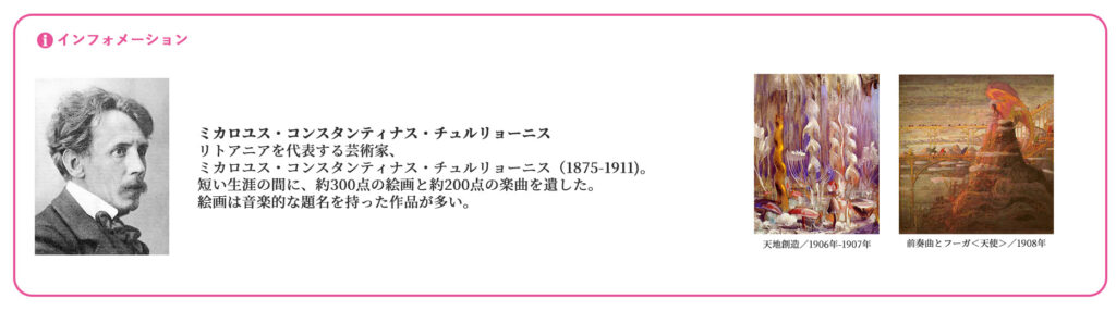 今年はさらに、東京文化会館 大ホールのホワイエでも、チュルリョーニスのピアノ作品をハープでお贈りする公演を開催。リトアニアが誇る画家/作曲家/思想家のチュルリョーニスは、母国では空港の名前につけられるほど、国の礎を築いた偉人の一人として称えられています。この機会にぜひお運びください。