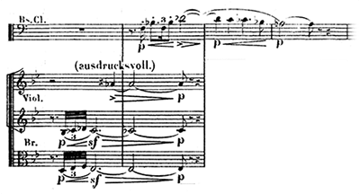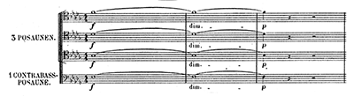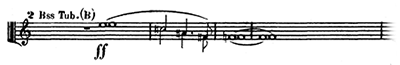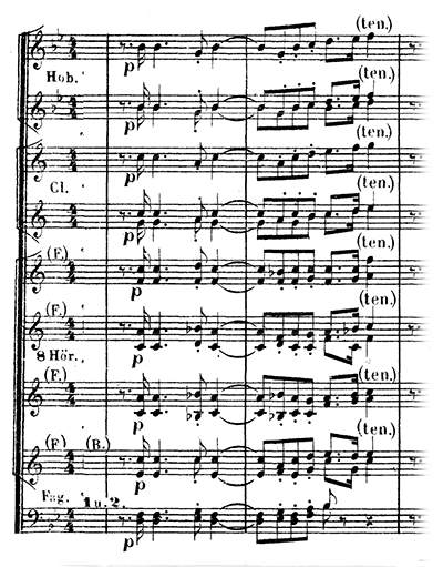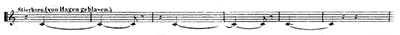 ハーゲンはなおもジークフリートの持つ指環を手に入れれば、世界を支配できるとそそのかす。ついにグンターもジークフリート殺害に同意してしまう。2人はジークフリートを狩りに呼び出して、背中を槍で突くことにする。復讐を誓うブリュンヒルデとグンター、2人を利用して指環を奪おうとするハーゲンによる三重唱。音楽は「贖罪の動機」「苦痛の動機」(譜例㊵)などを繰り返す。そこに「ギービヒの角笛の動機」とともに館からジークフリートとグートルーネの婚礼の行列が繰り出してくる中、再び金管楽器による「苦痛の動機」が鳴り響き幕となる。
