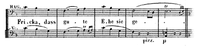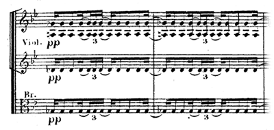「これは欺瞞だ!」と激しく詰め寄るブリュンヒルデ。彼女とジークフリートの言い合いに割って入り、火に油を注ぐように仕向けるハーゲン。ここでもブリュンヒルデと群集の動揺を表わすかのようにシンコペーション(譜例㊳)のリズムが使われる。それに乗じてハーゲンは「いいか、この女の言い分をよく聞くのだ!」と巧みに群集を煽っていく。家臣たちの前で面目を失うグンター。いきなりの異様な事態に驚く家臣たちも絡んで、劇的緊張が高まっていく。