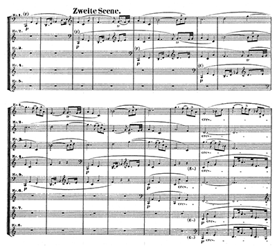 バス・クラリネットの導入にホルンが1本ずつ加わっていき、全8本になるまで和音(譜例㉚)を膨らませていくことで、夜が次第に明けていく様子を巧みに描いた間奏。夜明けとともにジークフリートが「ジークフリート角笛の動機」(譜例⑮)とともに帰還。ブリュンヒルデの拉致がうまくいったことを誇らしげにハーゲンに話す。一方、ブリュンヒルデと一夜を共にしたのではないかと早くも嫉妬心を燃やすグートルーネ。ジークフリートは「東と西の間には北があるように...」などとおかしな言い訳をして言いくるめてしまう。