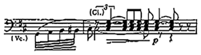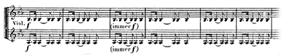 幕が開くとギービヒ家の館でハーゲンが柱にもたれかかり、まどろみながら見張りを続けている。そこに父アルベリヒが現れる。まどろむハーゲンの夢の中の出来事なのか、それとも現実なのか定かではない。そもそもこの時点でのアルベリヒの生死も不明である。弦楽器が重苦しくシンコペーションのリズム(譜例㉗)を刻む中で、2人の"対話"が繰り広げられていく。ワーグナーの作品でこうしたシンコペーションが使われる場合、大抵、登場人物の迷いや心理的な動揺、精神的な揺らぎを表わしていることが多い。やはりアルベリヒの登場は、ハーゲンの精神の中での出来事なのだろうか。アルベリヒは「恨みとねたみこそが、我々に共通するエネルギーである」と言い、ハーゲンに世界を征服するために指環の奪還を誓わせようとする。「呪いの動機」(譜例⑧)や「指環の動機」(譜例㉘)とともに「殺人の動機」(譜例㉙)が何度か現れては消えていく。ハーゲンは「心配無用だ」と答える。